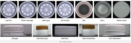 The intelligent AI cap quality vision testing machine can perform full areas comprehensive inspection on the appearance defects of products, including conventional defects black spot, crack, thread, flash, short shot, deformation, etc